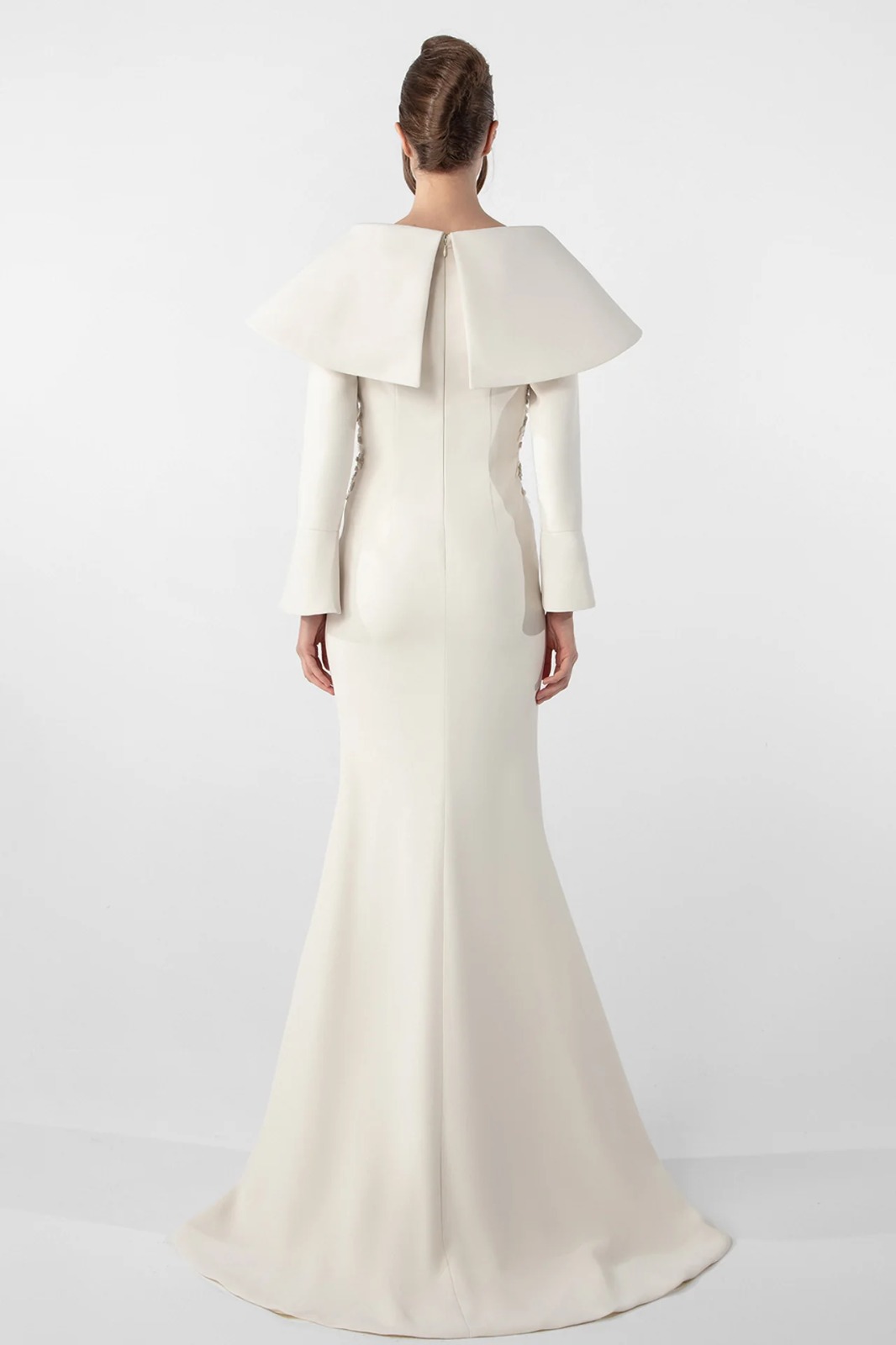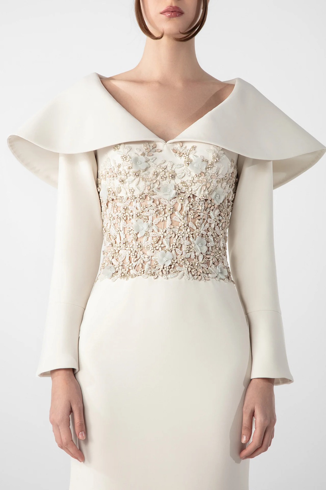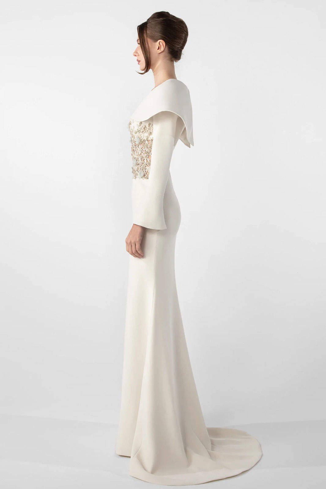 A mermaid dress in ivory crepe fabric with a structured cape collar, long sleeves and a fitted silhouette. The bodice is adorned with hand-applied embroidered stones and crystals.